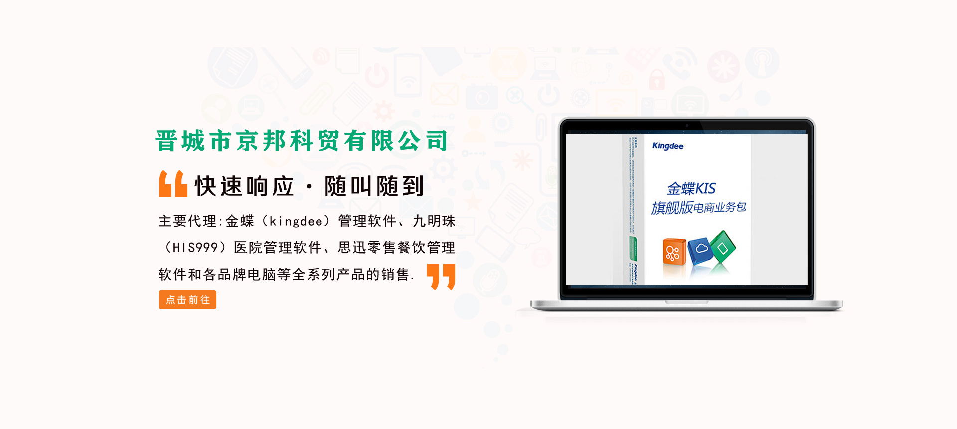 晉城市京邦科貿(mào)有限公司成立于2006年,是經(jīng)晉城市工商行政管理局登記注冊,主要從事軟件銷售、電腦銷售和企業(yè)管理咨詢等相關(guān)業(yè)務(wù),是金蝶軟件(中國)有限公司、深圳九明珠信息科技有限公司、深圳萬國思迅軟件有限公司在晉城地區(qū)高級代理商,主要代理金蝶(kingdee)管理軟件、九明珠(HIS999)醫(yī)院管理軟件、思迅零售餐飲管理軟件和各品牌電腦等全系列產(chǎn)品的銷售。